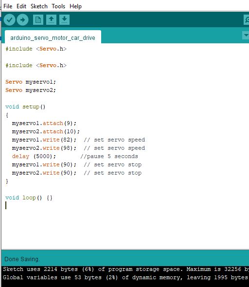 This is a basic Arduino code to get two wheels to rotate. This project uses continuous rotation servo motors. Although I am using a motor driver board with my Arduino, in actuality a driver board is NOT needed. The pictured BRAIN PAD is not used in this example, so ignore it.